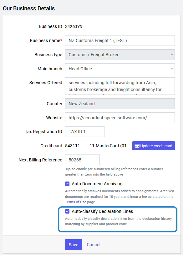 A checkbox for 'Auto-classify Declaration Lines' is available at the to the Business details and edit pages under Settings.