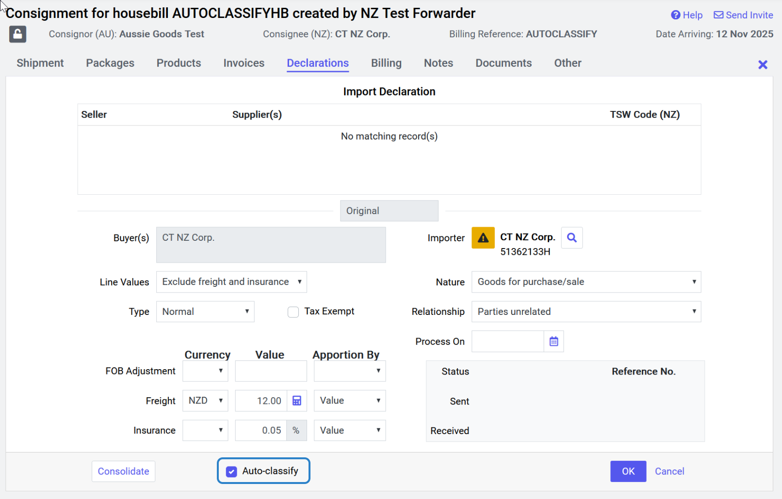 “Auto-classify Declaration Lines” sets the default value of the auto-classify checkbox at the Consignment level.